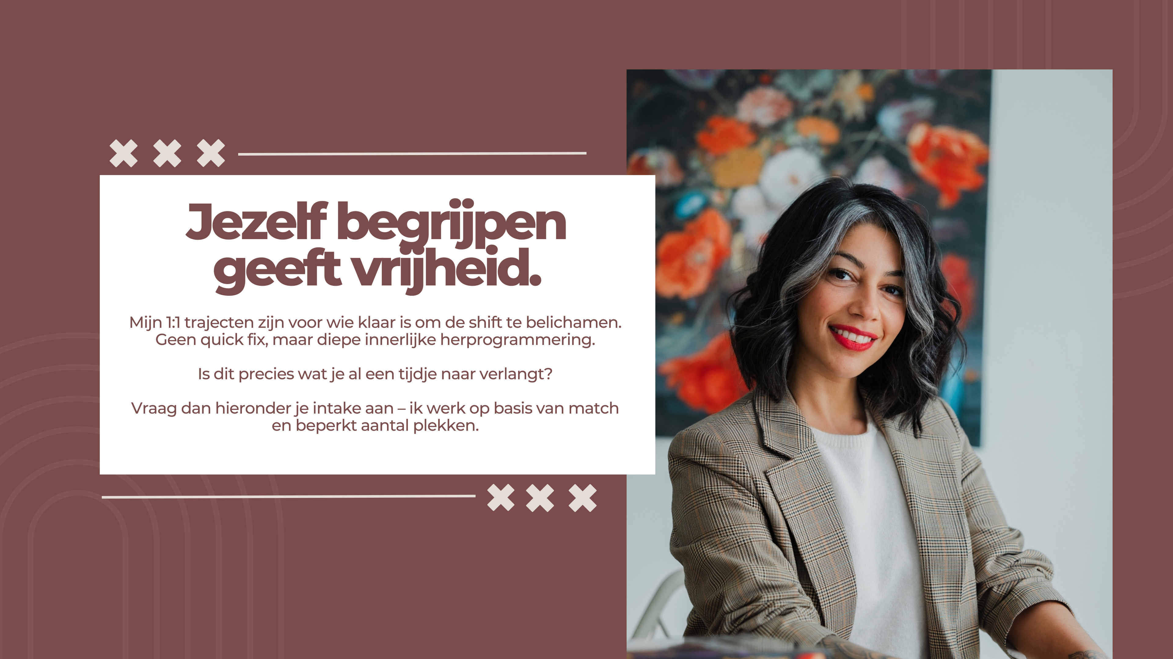 Ik leer je zien wat er in jezelf speelt, oude patronen doorbreken en dit vertalen naar concrete keuzes in je leven en onderneming. Zo bouw je niet alleen aan zelfvertrouwen en helderheid, maar ook aan een duurzaam fundament voor succes dat écht bij jou past.